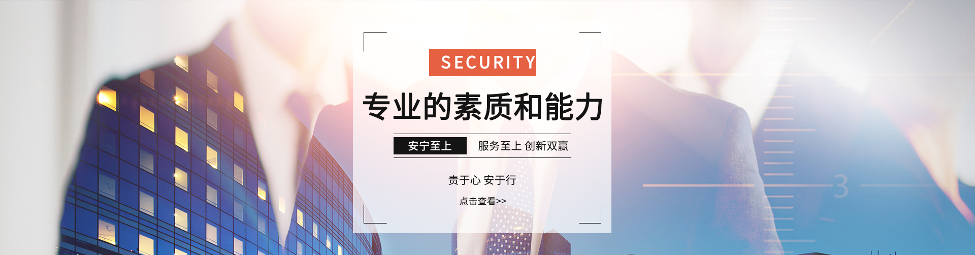 公司始終堅(jiān)持“務(wù)實(shí)、求精、效益、創(chuàng)新”的質(zhì)量方針,奉行“維護(hù) 雇主事業(yè)管理秩序,捍衛(wèi)雇主事業(yè)運(yùn)營(yíng)安全,致力于雇主事業(yè)長(zhǎng)期發(fā)展的保駕護(hù)航”服務(wù)宗旨,不斷加強(qiáng)公司管理層和員工隊(duì)伍建設(shè),以專(zhuān)業(yè)化、標(biāo)準(zhǔn)化的優(yōu)質(zhì)高效的服務(wù)質(zhì)量為各企事業(yè)單位提供專(zhuān)業(yè)的安全保衛(wèi)及物業(yè)管理服務(wù)。
